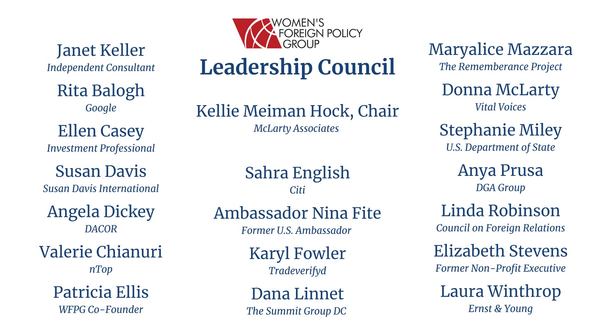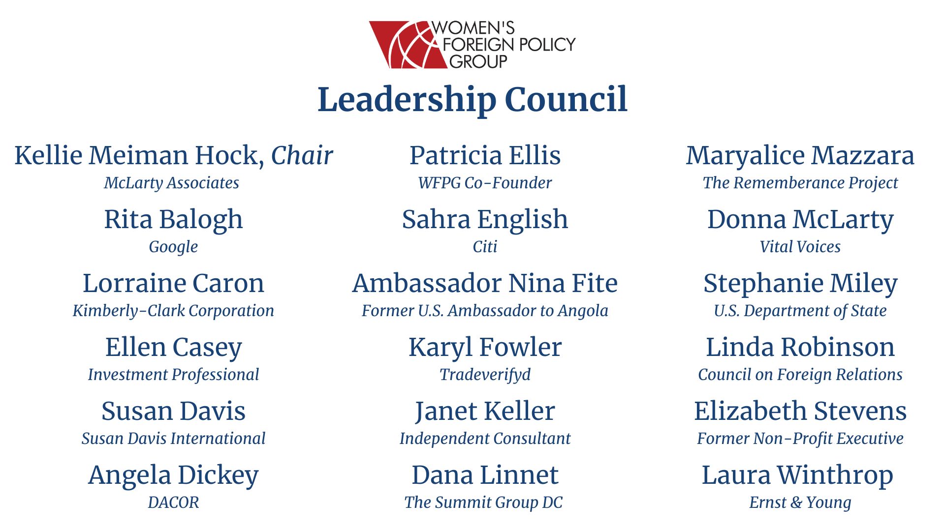 As a Leadership Council member, you will have the opportunity to connect with fellow women leaders from across the field and receive access to our unique combination of programming that allows our members to continually enhance their knowledge and contacts in this fast-changing field. WFPG's Leadership Council is open to women and men with experience in global issues or international business, who are committed to the promotion of women's leadership and engagement in international affairs.